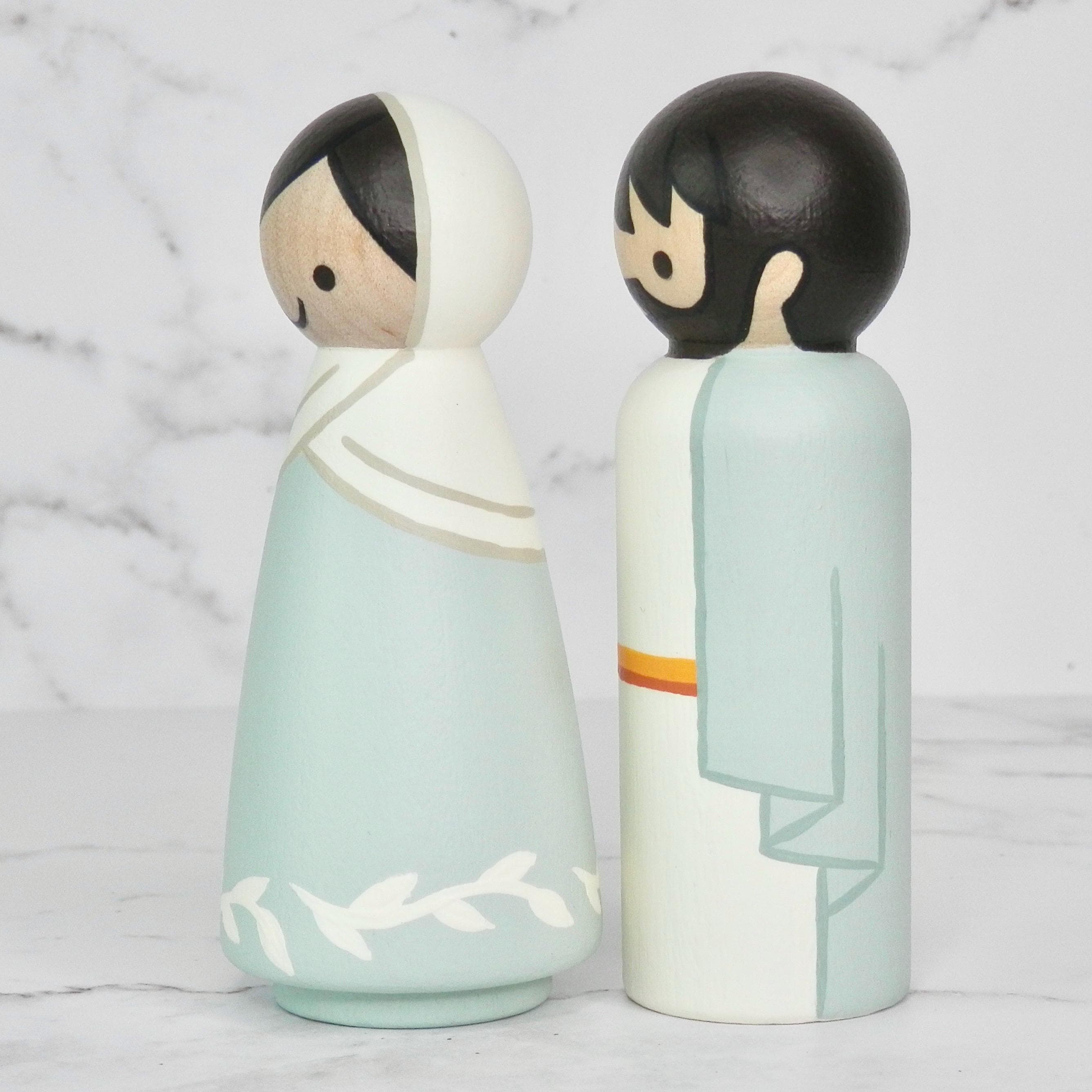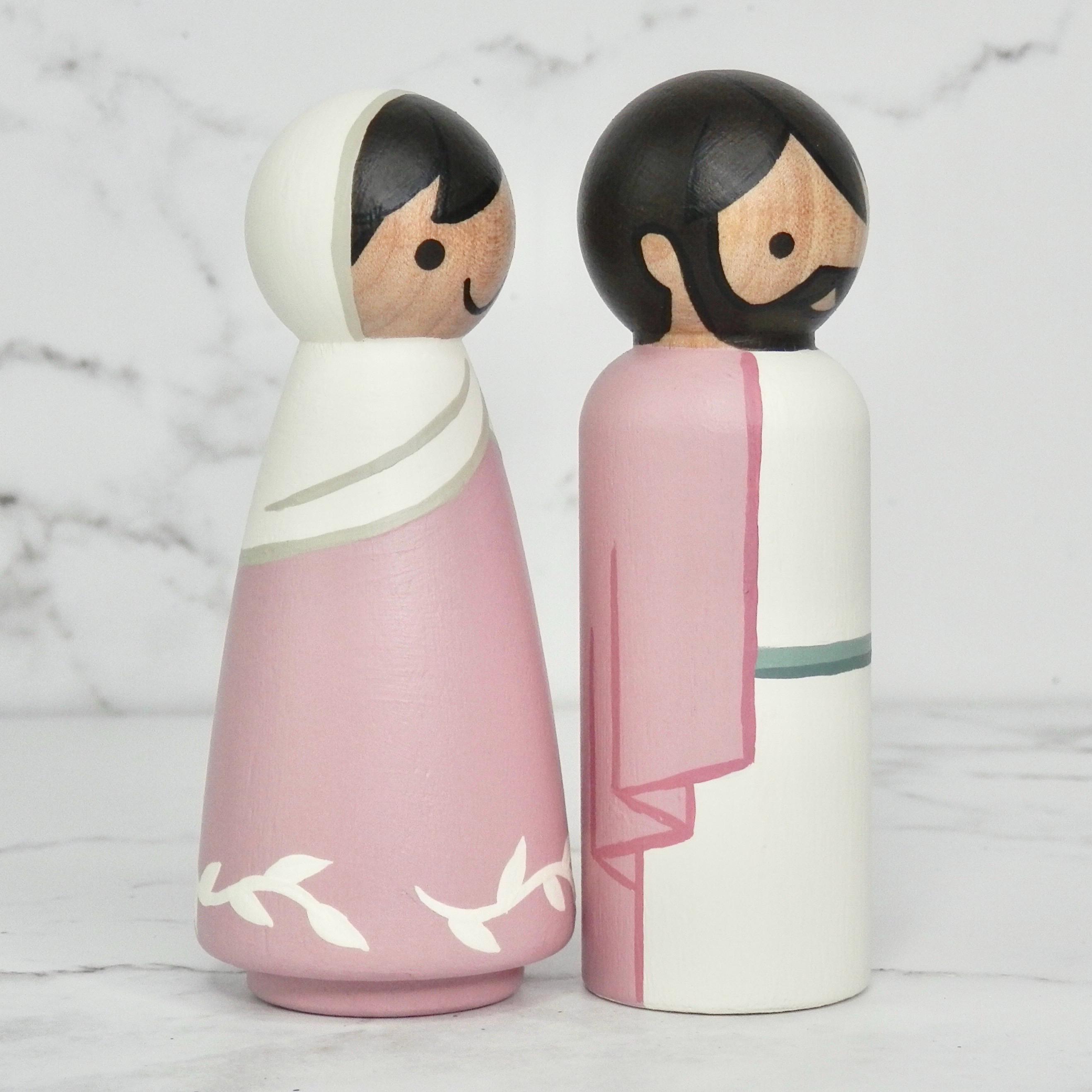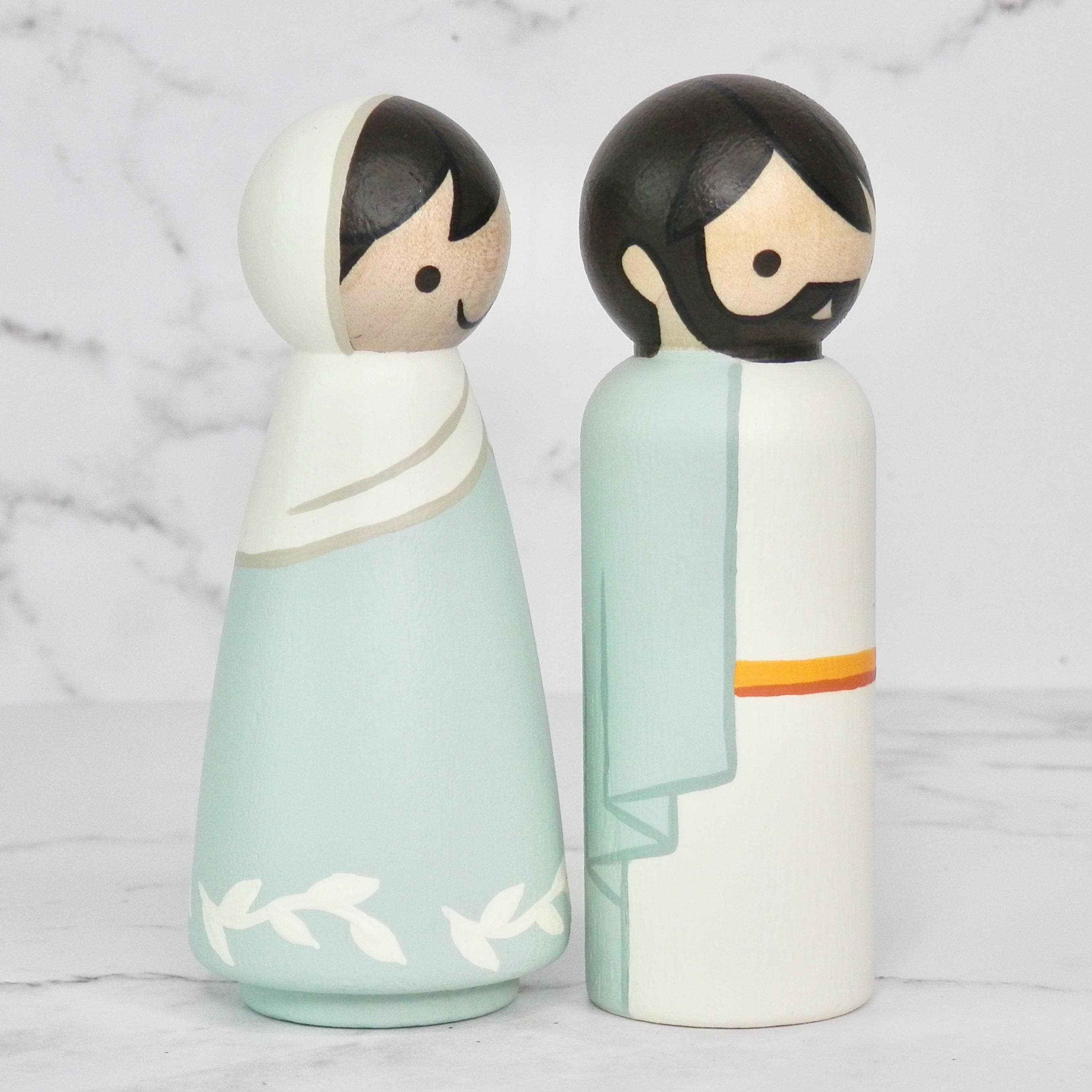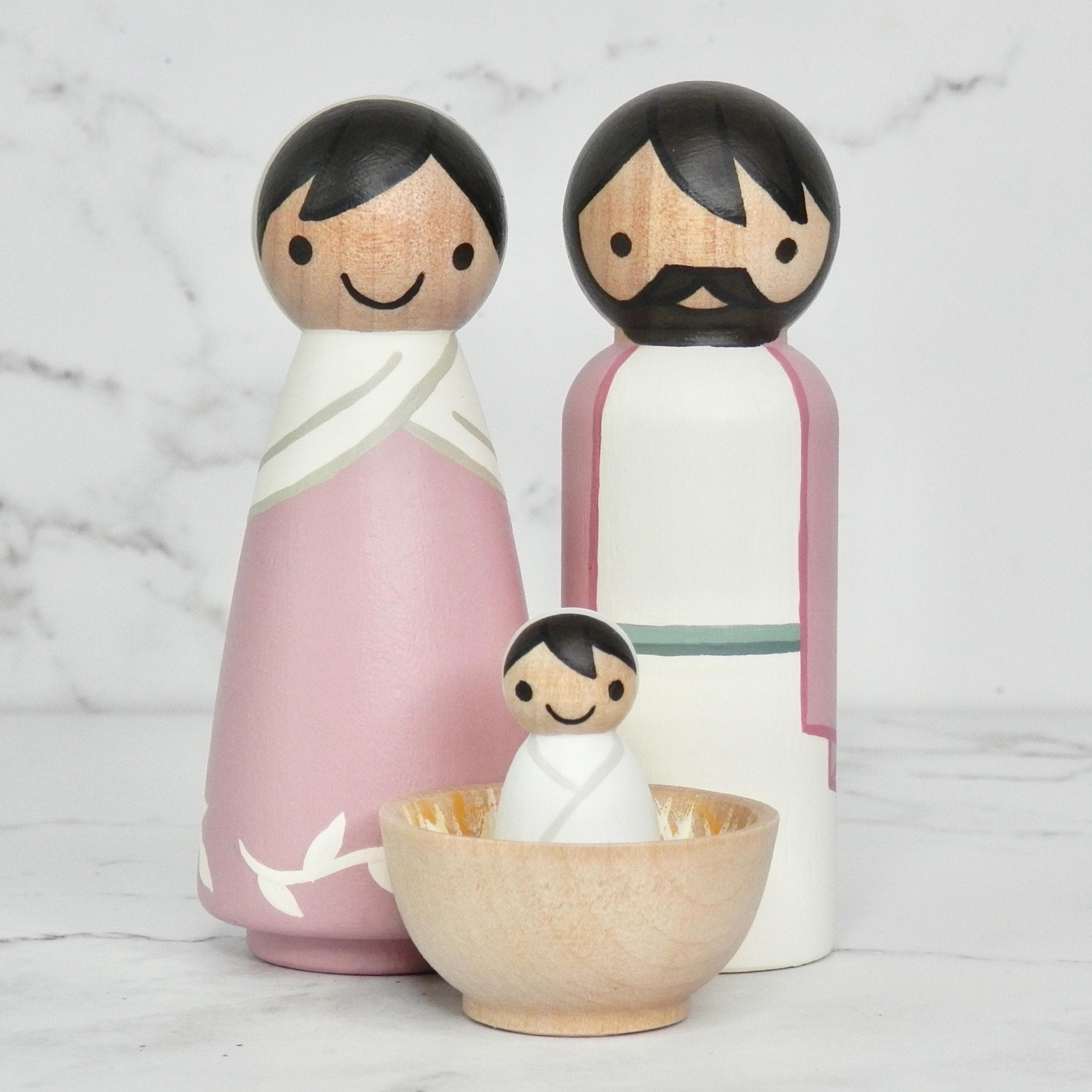 Hand painted wooden peg doll nativity set. This 4-piece set includes: May, Joseph, Baby Jesus and a manger. Sets available in Mint or Pink