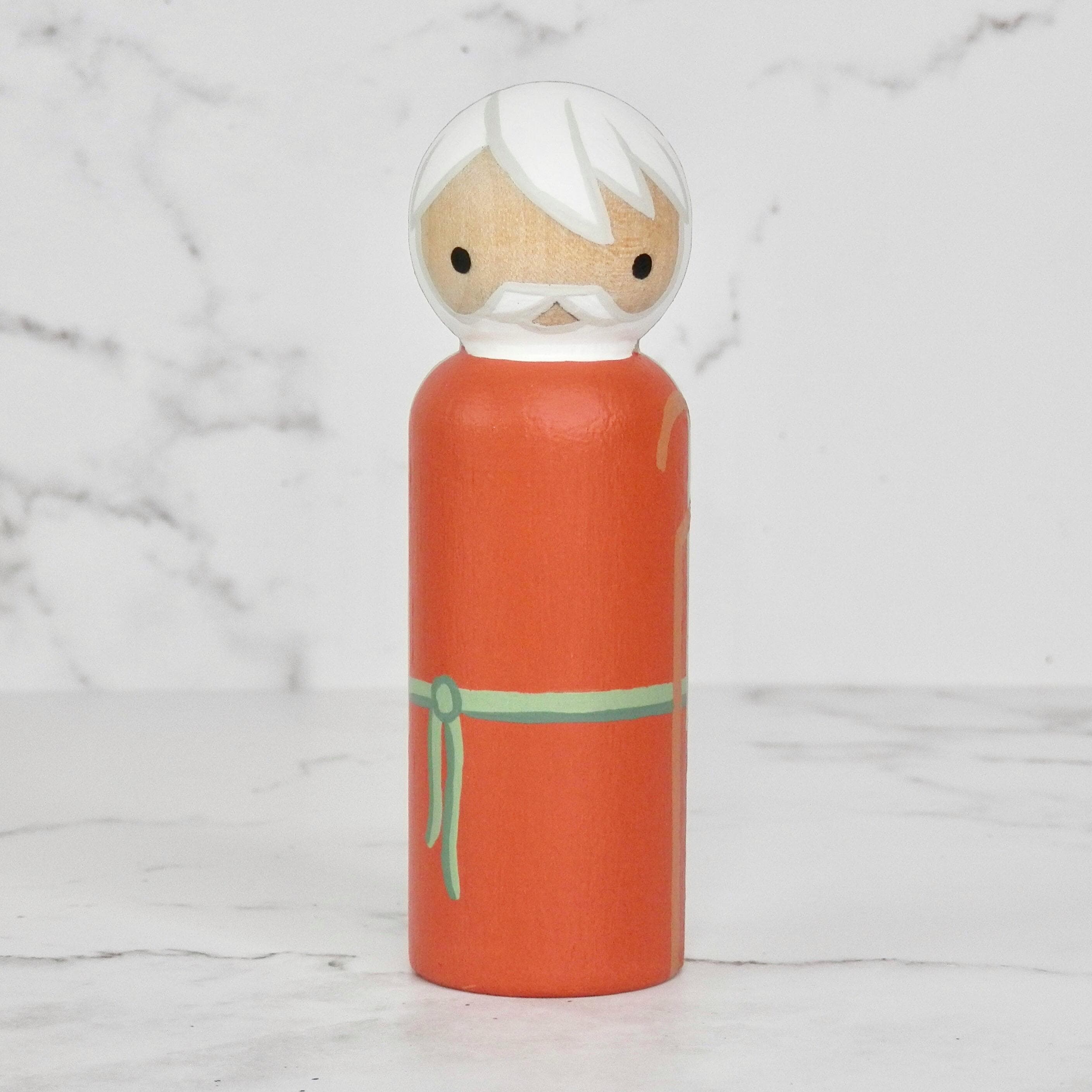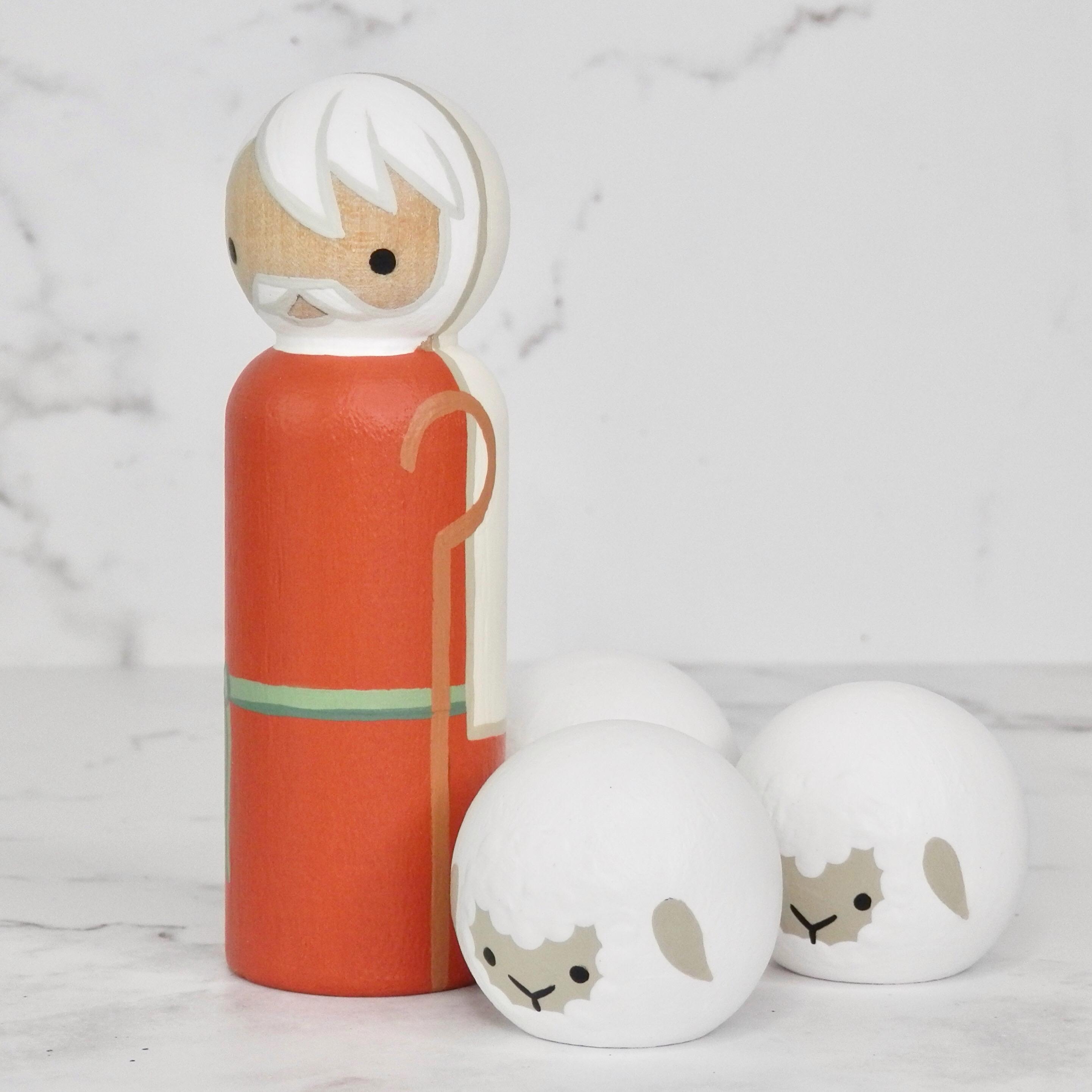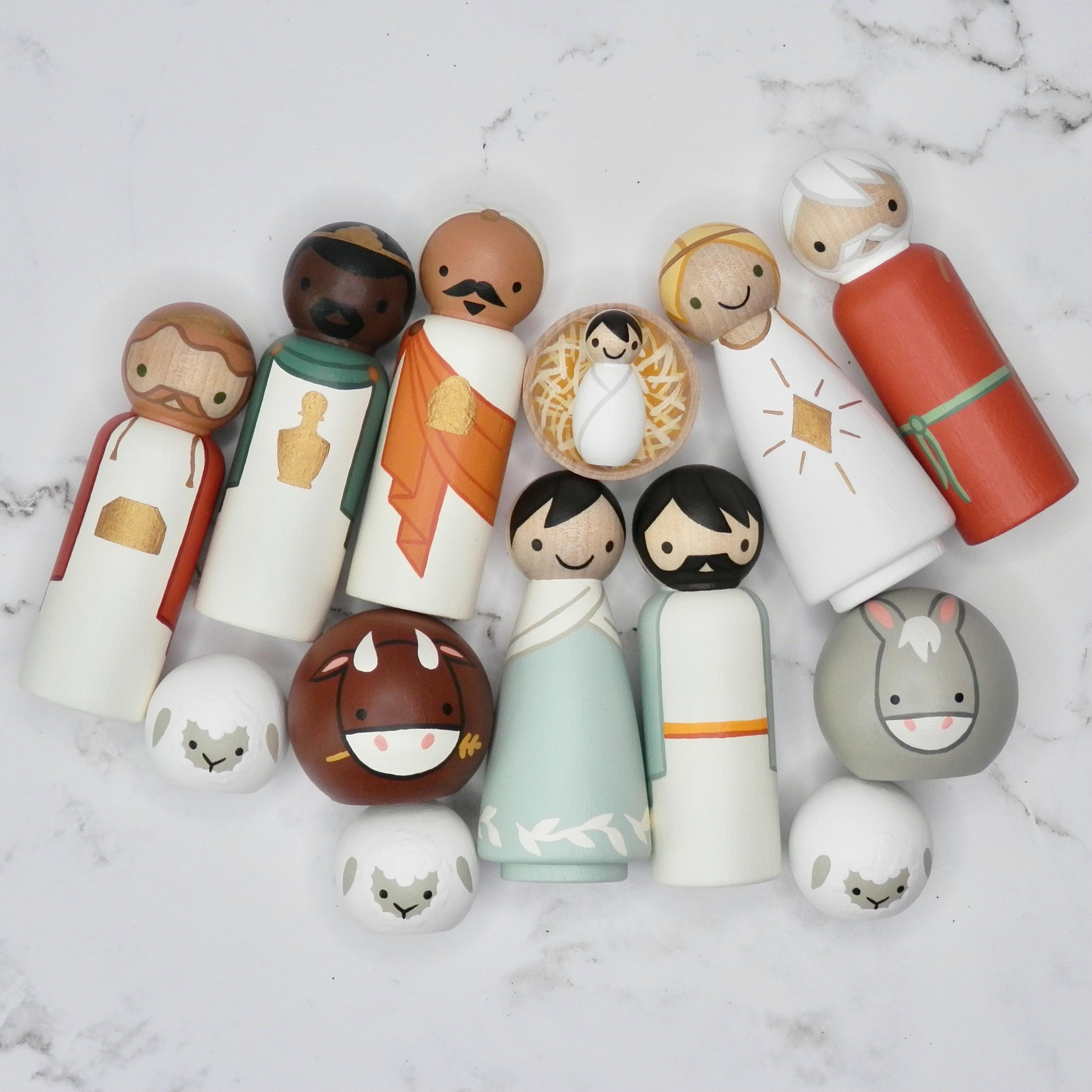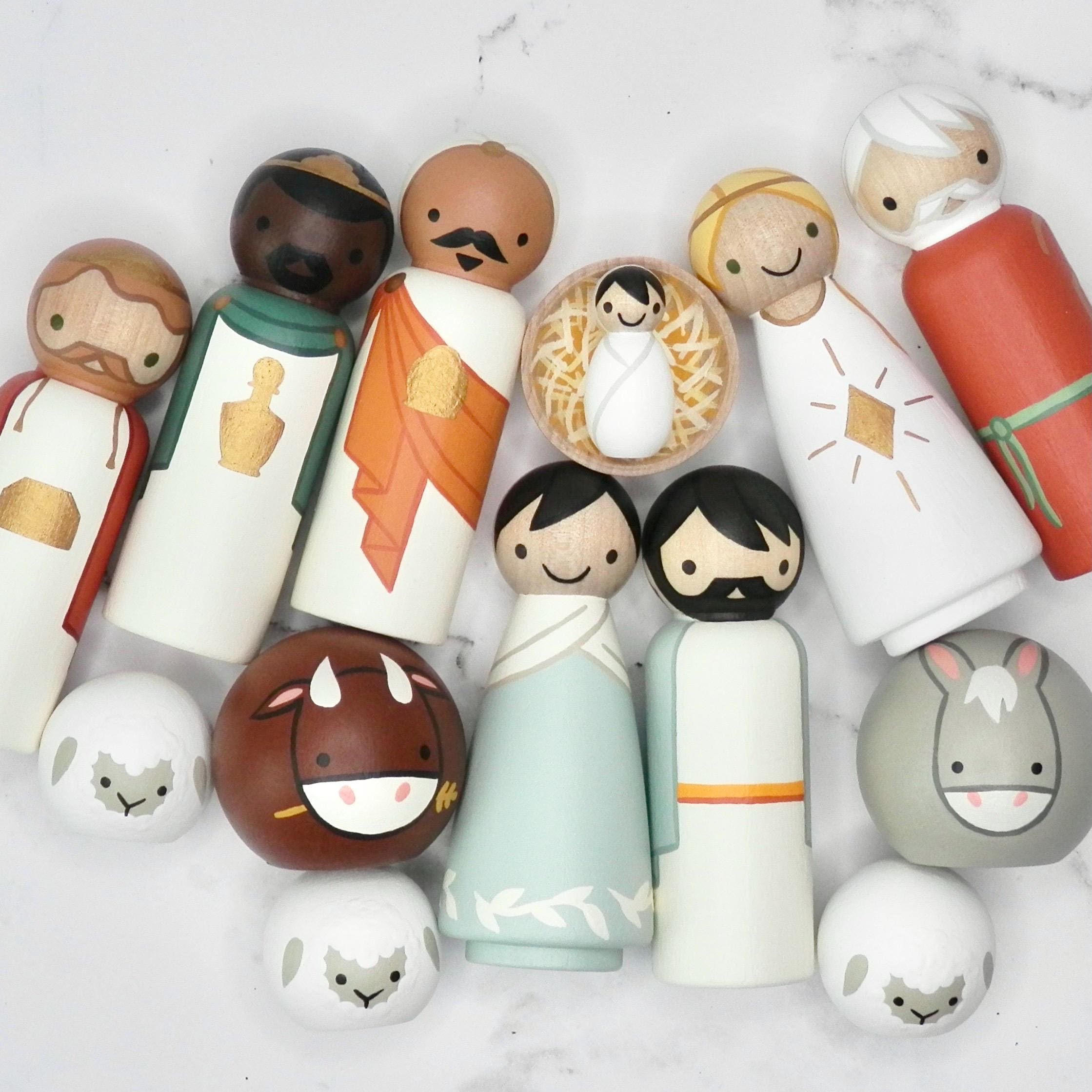 Hand painted wooden peg doll complete nativity set. This 14-piece set includes: May, Joseph, Baby Jesus and a manger, Three Wisemen, Angel, Shepherd and three sheep, Donkey, and Cow.