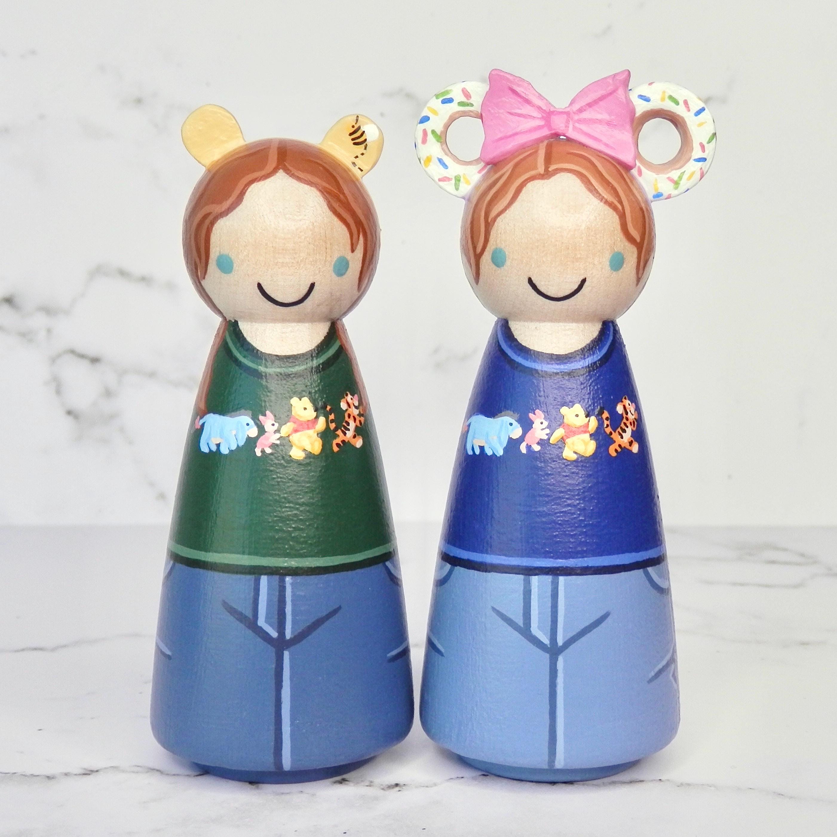 Peg dolls are available in two different shapes. Please refer to the pictures for specifics. Dolls are painted and finished with nontoxic acrylic paint and varnish.