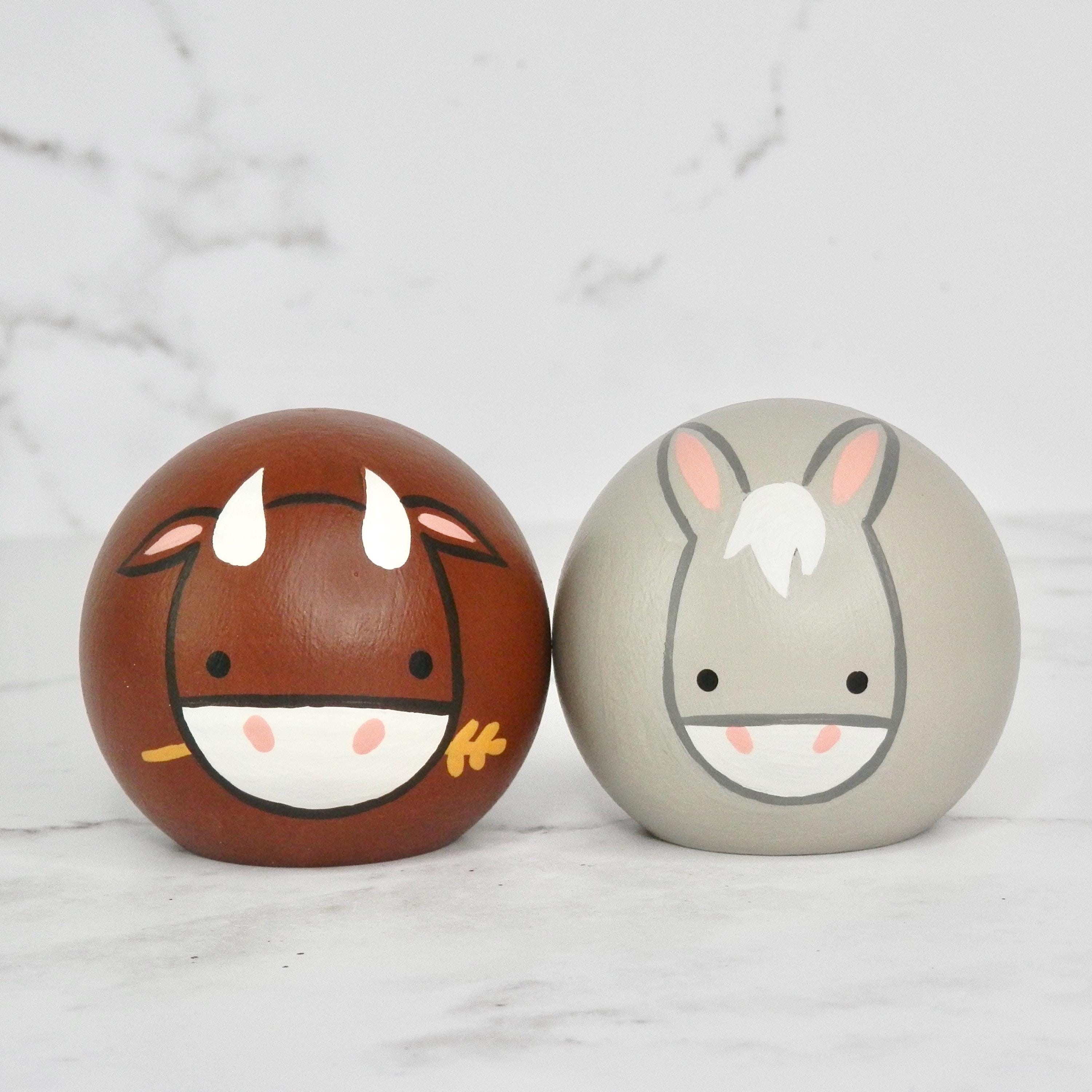 Hand painted wooden nativity animals. This 5 piece set includes: 1 donkey, 1 cow, and 3 sheep. There are two different sizes that match the two differ sizes of nativities that I offer. The small size matches the 2-3/8” set, and the larger size matches the 3.5” set.
