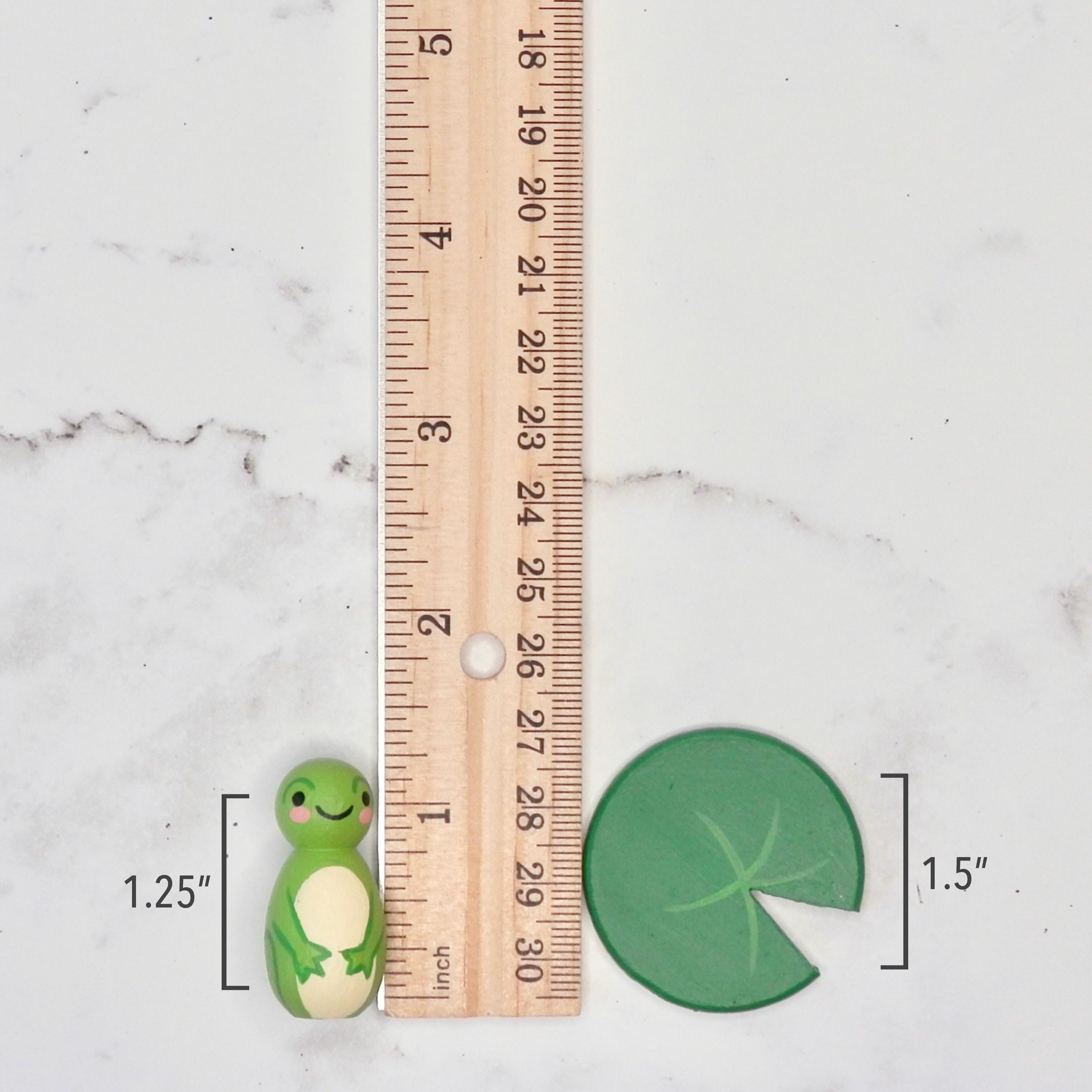 This two-piece hand painted set comes with a frog and a lily pad, pieces are not attached. This set would make a great addition to a nature themed sensory activity, small world play, or as a friendly and sweet addition to a little fairy garden.