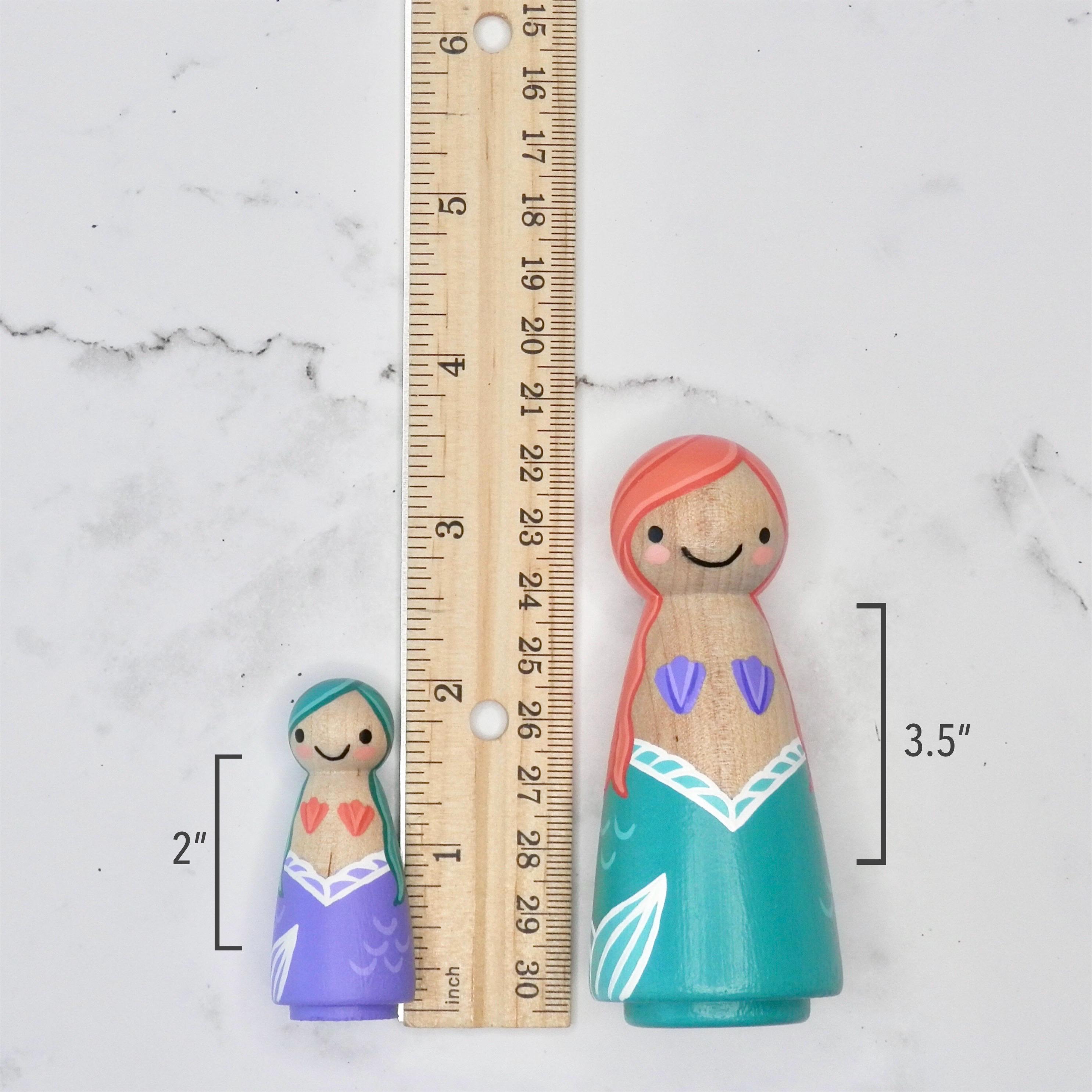 Hand painted wooden peg doll mermaids. With these dolls your child can go on undersea adventures and explore the ocean though pretend play.
